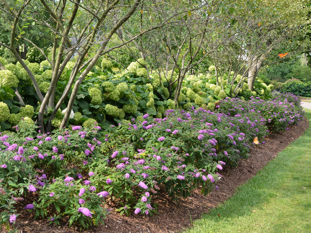 This scene was photographed in our trial gardens in zone 6. The butterfly bushes face south, while a row of small serviceberry trees lightly shades the hydrangeas on the north side of the bed. Incrediball flowers earlier in the summer, producing huge white mophead blossoms that age to a lush jade green, providing a stunning backdrop for the periwinkle-purple flowers of the butterfly bush that bloom from midsummer through fall.