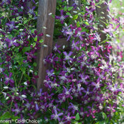 Cranberry-purple flowers. Fragrant. Vine. Long bloom time.