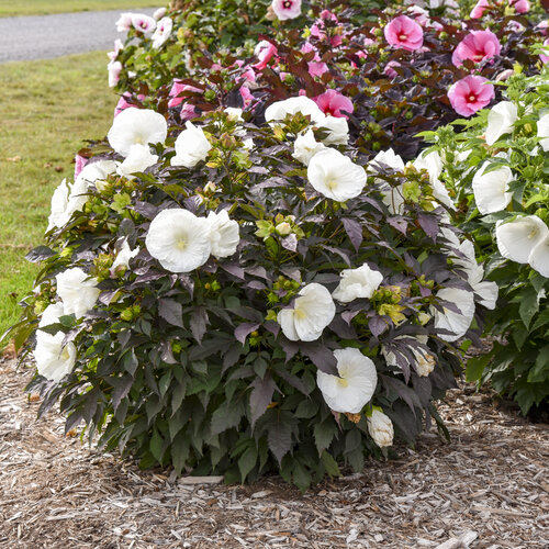 A night and day combination of matte black foliage and pure white flowers. Like other dark-leaved Hardy Hibiscus, full sun is necessary to bring out the deepest foliage color.